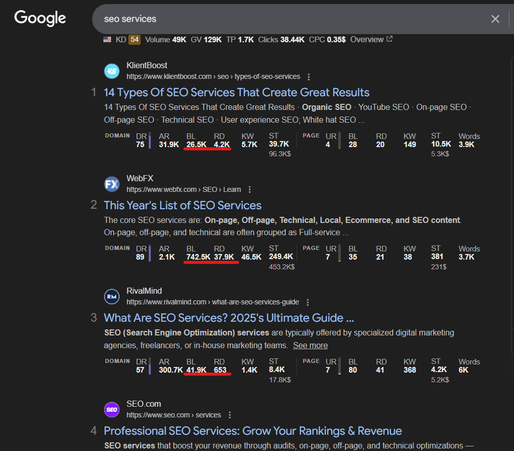 When I searched “seo services” on Google. The top-ranking pages have a huge number of backlinks referring to that specific page. Here I’ve used the Ahrefs tool extension, which shows that the first page shown on Google has 26.5k BL(backlinks) and 4.2k RD(referring domains).