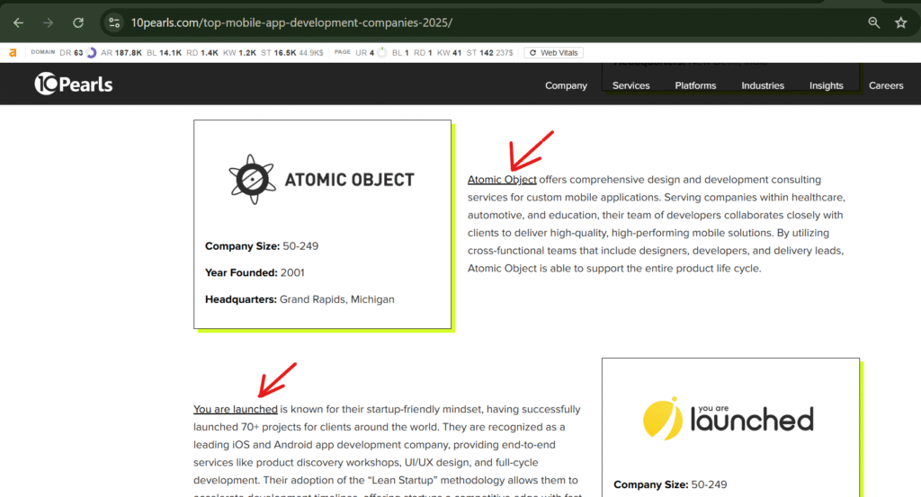 Here’s an example. When I searched top mobile app development companies, the first result was a 10perals.com listicle blog in which different companies are mentioned. Whenever a person clicks on the link of the mentioned site, the site gets referral traffic from 10perals.com. The referral traffic must be relevant to your niche because your link is added in the relevant niche article.