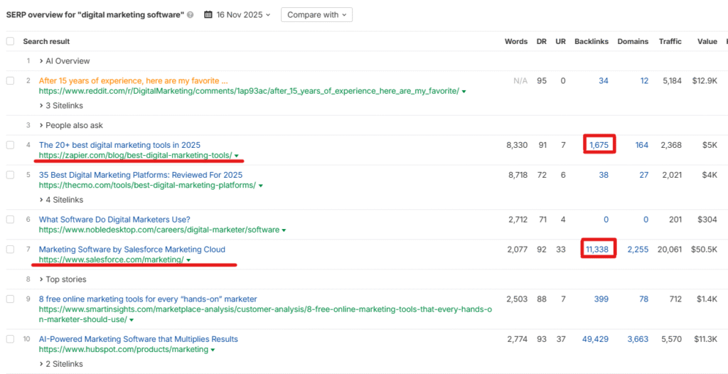 Let me clear this with an example. Screenshot below is the result of the query “digital marketing software.” Why is zapier ranking above salesforce, whereas zapier has 1,675 backlinks and salesforce has 11,338 backlinks?