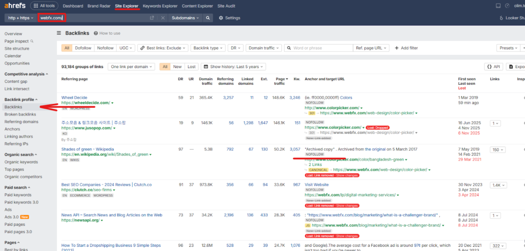 Let’s take webfx.com as an example and search for its harmful backlinks. First, you go to the backlink section in the site explorer tab.