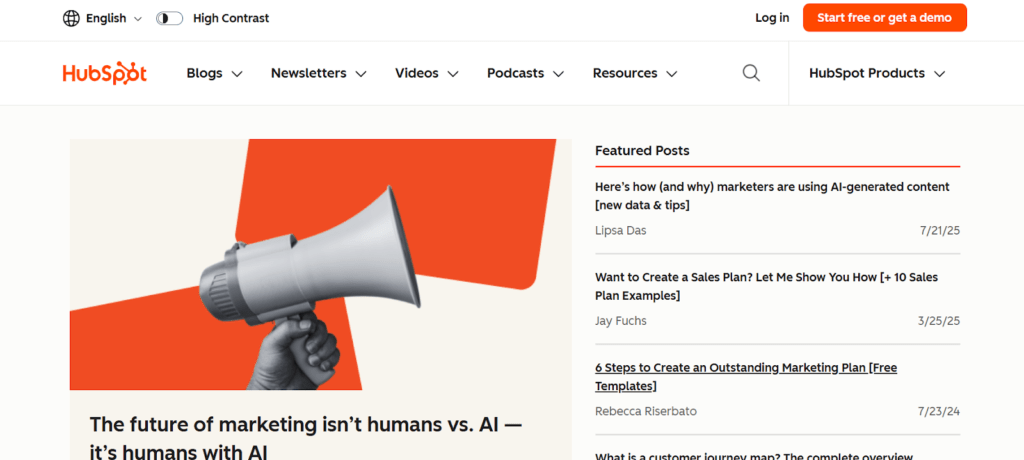 The HubSpot Blog focuses on inbound marketing, sales strategies, customer service, CRM software, AI tools, and overall business growth. It regularly publishes long-form, data-driven content aimed at marketers, founders, and business professionals.