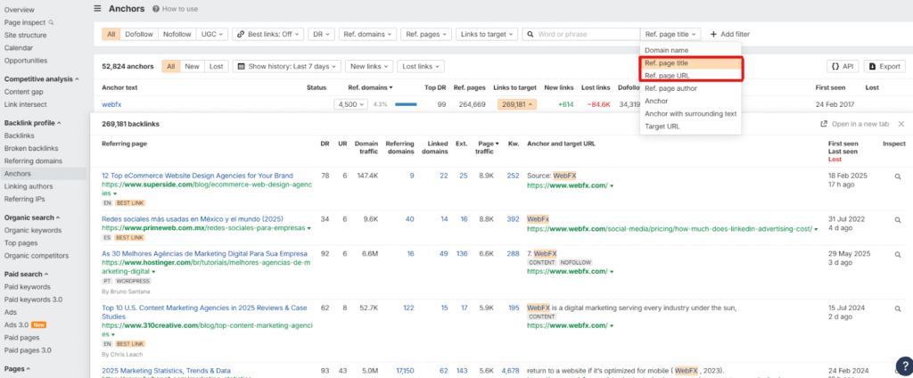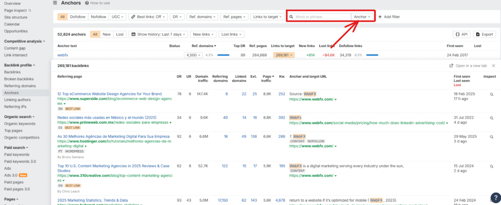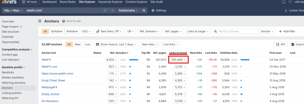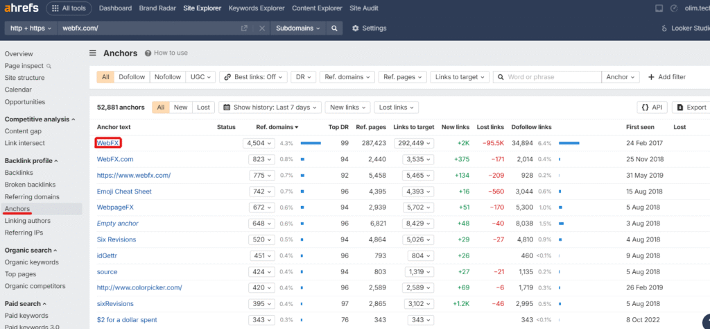 In our case, we have to find the anchor text “WebFX” because our competitor is webfx.com