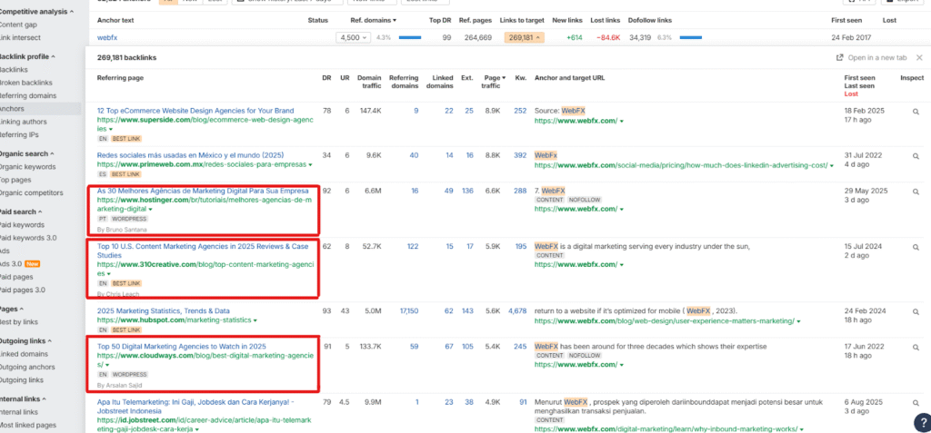 Once you click on this, you’ll see links of all the website blog posts where WebFX is mentioned. Here, you’ll also find listicle blogs like the ones shown in the red boxes in the screenshot below.