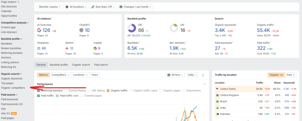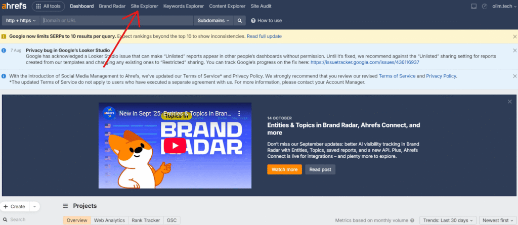 Using Ahrefs, navigate to the Site Explorer tab and enter your site’s URL, such as https://linkcrafters.com/.