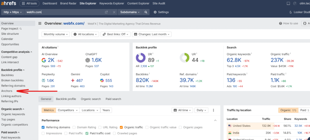 For instance, we are a digital marketing agency, and we know our competitors now. Consider webfx.com as your digital marketing agency competitor. Paste it into the Site Explorer of Ahrefs. On the left side menu, go to the anchors of that specific site.