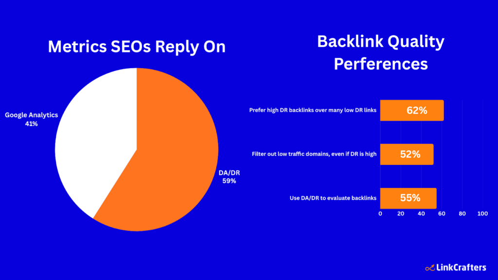 - 59% of SEO professionals rely on Domain Rating (DR) or Domain Authority (DA) as a core link quality metric given by Ahrefs and Moz, respectively. Others 41% reply on Google search console or Google analytics.
