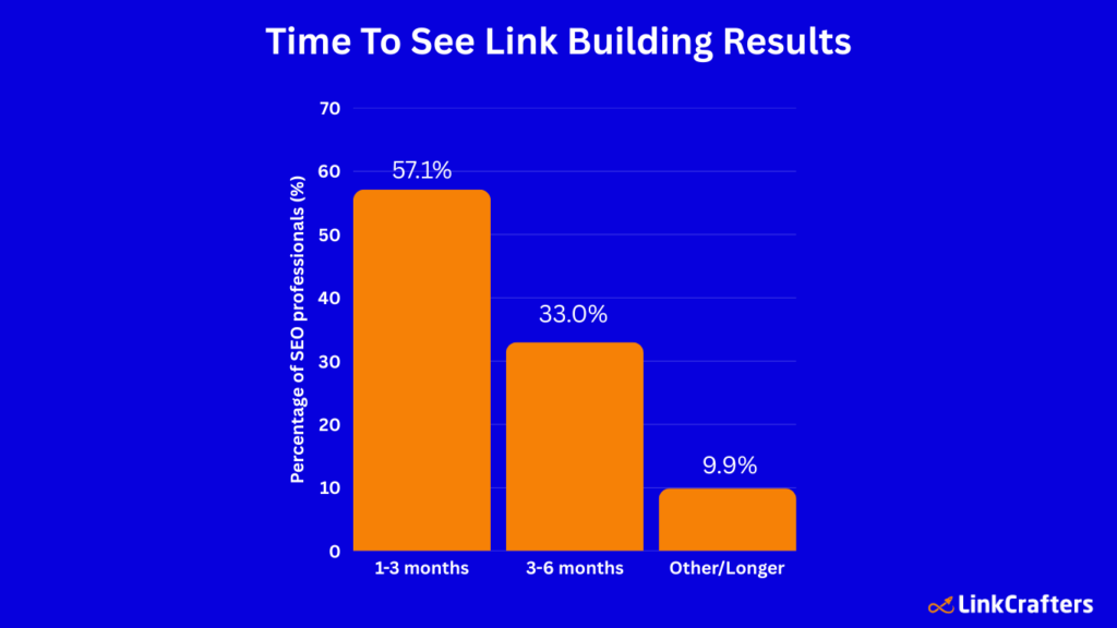 - 57.1% of SEO professionals report seeing link-building results within 1–3 months of investment, while 33.0% see results in 3–6 months.