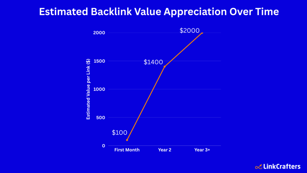 The cumulative value of backlinks rises over time — e.g., the value per link can grow from ~$50–$150 in the first few months to $800–$2,000+ by Year 2, and $1,000–$3,000+ at Year 3+.