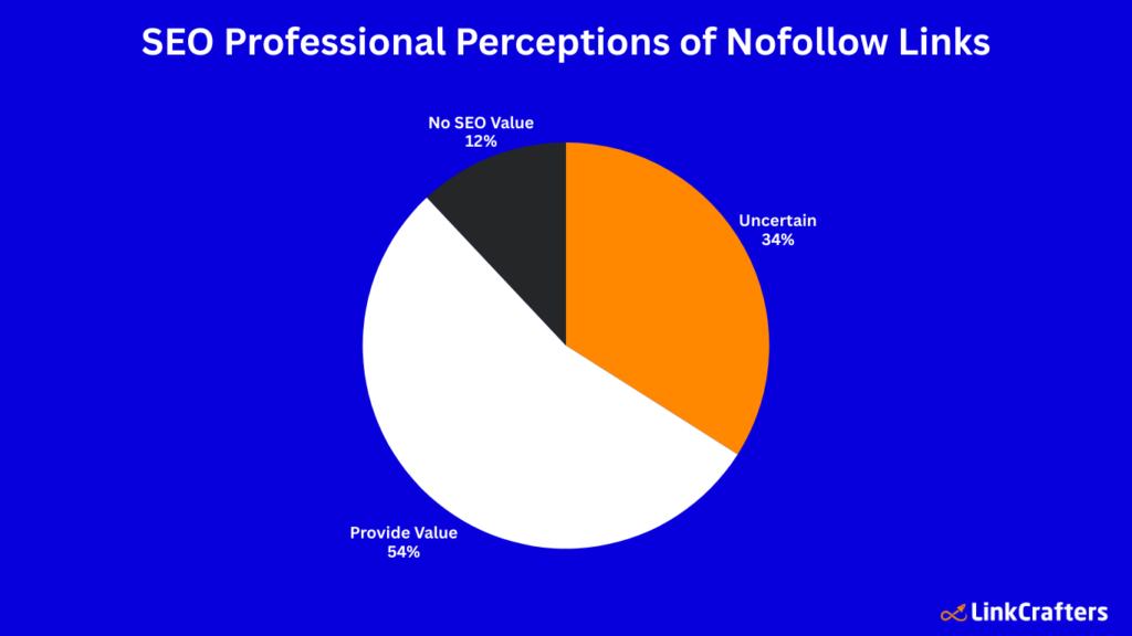- 54% of SEO professionals believe that nofollow links contribute to a site’s authority and rankings, challenging the idea that they’re worthless. Only 12% say they have no SEO value at all, while 34% are uncertain.