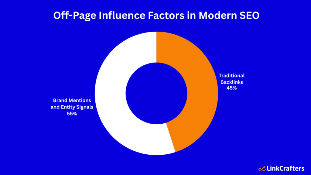 - SearchAtlas data suggests that search engines now weigh brand mentions and entity signals more heavily than backlinks in many ranking calculations (with brand mention/ entity signals comprising 55% of off-page influence vs. ~45% for backlinks in some models), indicating brands with visibility may find links easier to attract.