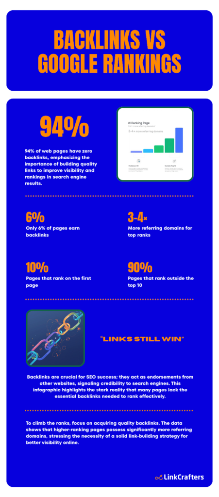 - 94% of online content earns zero external backlinks, highlighting how rare any link is, let alone high–quality ones.
