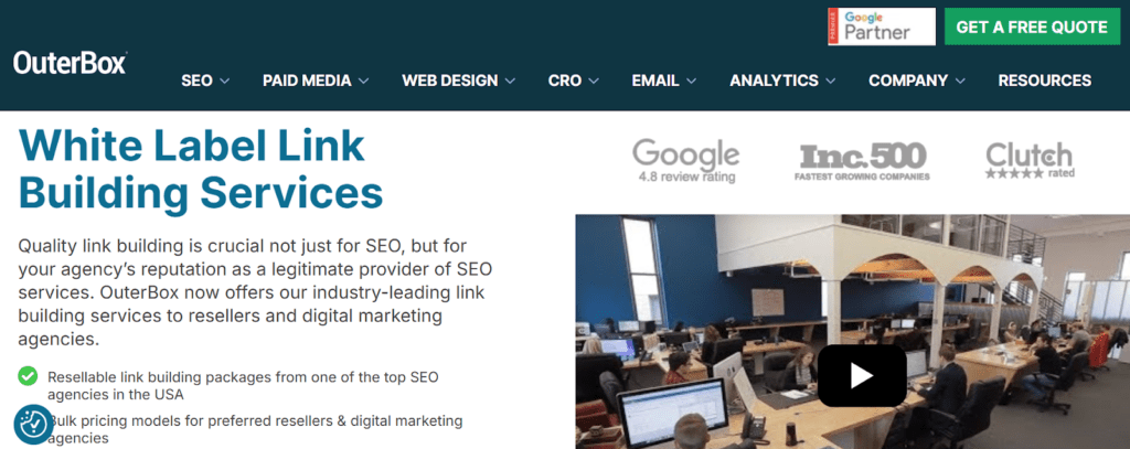 OuterBox offers white hat link building services aimed at SEO resellers and other agencies. Their link building work is done in-house and follows white-hat SEO practices, focusing on building or earning backlinks from relevant and authoritative sites through outreach, content creation, and backlink strategy rather than automated shortcuts.