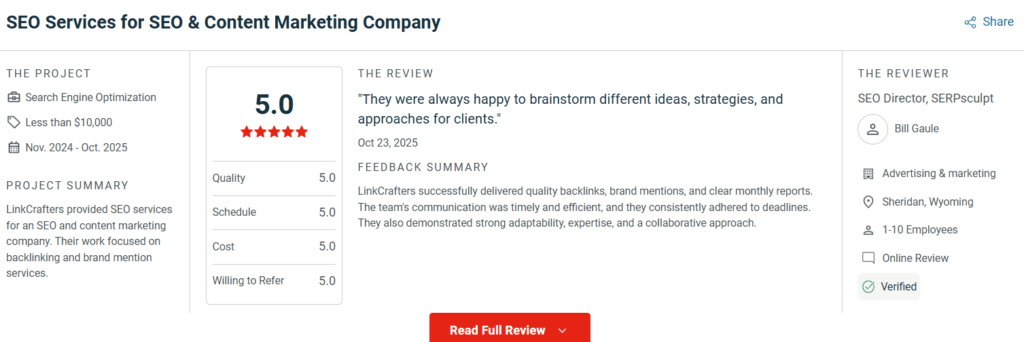 - Average Project Cost: Client reviews on third-party sites indicate that average project costs often fall within the “Less than $10,000” or “$10,000 to $49,000” brackets, depending on the scope and volume of links required.