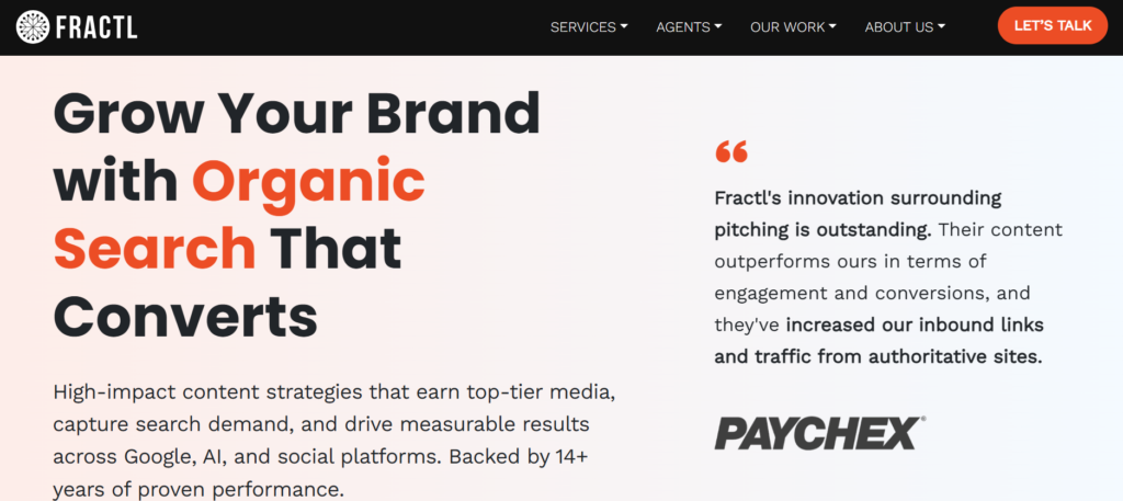 Fractl is known for combining data journalism with SEO, helping brands earn high-authority backlinks through original research, creative campaigns, and media outreach.